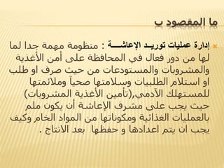 تتحدث الوثيقة عن أهمية إدارة وتوريد عمليات الإعاشة في منشآت الطعام، مع التركيز على تأمين سلامة وسلامة المواد الغذائية. تناقش الوثيقة أيضًا المتطلبات الأساسية لتجهيز المنازل والمكاتب، بالإضافة إلى المعايير الصحية الضرورية لضمان الجودة في خدمات الطعام المقدمة.