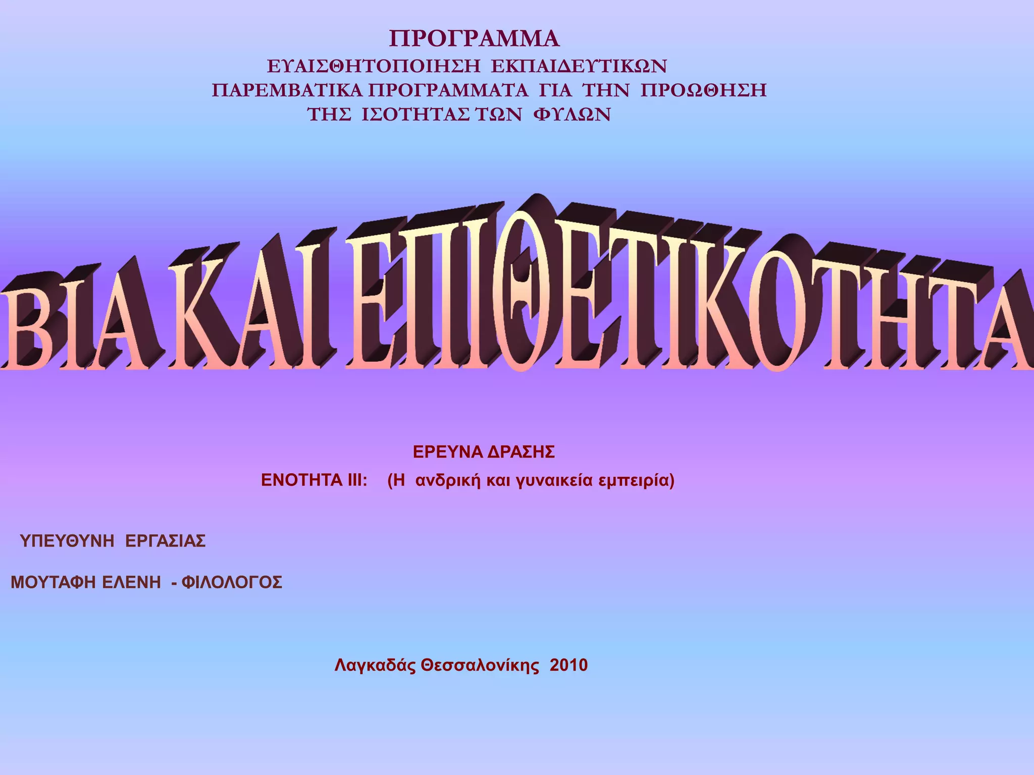 ΓΙΑ ΤΗΝ ΠΡΟΩΘΗΣΗ ΤΗΣ ΙΣΟΤΗΤΑΣ ΤΩΝ ΦΥΛΩΝ ΕΡΕΥΝΑ ΔΡΑΣΗΣ ΕΝΟΤΗΤΑ III: (H ανδρική και γυναικεία εμπειρία) ΥΠΕΥΘΥΝΗ ΕΡΓΑΣΙΑΣ ΜΟΥΤΑΦΗ ΕΛΕΝΗ - ΦΙΛΟΛΟΓΟΣ Λαγκαδάς Θεσσαλονίκης 2010