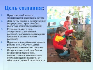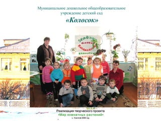 Документ описывает проект детского сада «Колосок», целью которого является создание зимнего сада лекарственных комнатных растений и обогащение экологического воспитания детей. В проекте предусмотрены этапы подготовки, активного погружения и заключительной презентации, направленные на развитие творческого мышления и навыков работы с природой. Результатом выполнения проекта станет календарь комнатных лекарственных растений и улучшение показателей физического, познавательного и эстетического развития детей.
