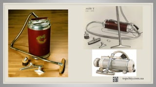 Документ описывает историю создания пылесоса, начиная с первых примитивных моделей 19 века до современного роботизированного оборудования. Упоминаются ключевые изобретатели и их разработки, такие как механизированный пылесос Ивза Макгаффни и робот-пылесос Roomba от iRobot. Автор показывает, как технологии уборки эволюционировали, облегчая жизнь домохозяек.