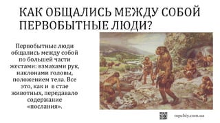 Документ представляет собой презентацию о значении общения и его развитии от первобытных времен до современности. Обсуждаются различные формы общения и их влияние на общество, а также важность навыков общения и поддержания личных границ в цифровом мире. Приведены советы по эффективному общению и предостережения о безопасности при использовании технологий.