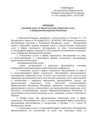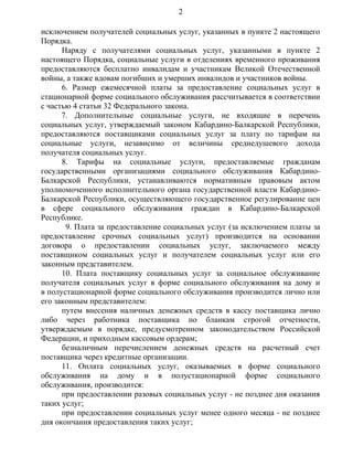 Документ утверждает порядок взимания платы за социальные услуги в Кабардино-Балкарской Республике, определяя, что услуги могут предоставляться бесплатно определённым категориям граждан. Для остальных получателей социальных услуг плата устанавливается в зависимости от их среднедушевого дохода и вида оказываемых услуг. Размеры оплаты и условия возврата излишне уплаченных сумм также подробно регламентированы.