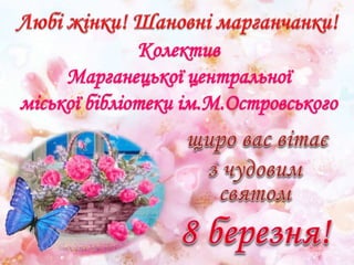 З нагоди Міжнародного жіночого дня 8 березня колектив ЦМБ ім.М.Островського вітає всіх марганчанок зі святом! Вітальну листівку підготувала бібліограф Марганецької міської ЦБС Ольга Забенько.