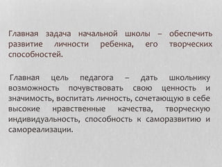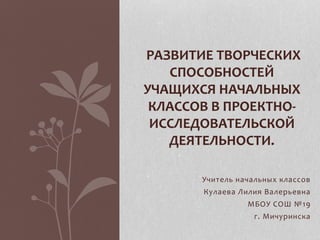 Документ описывает методы развития творческих способностей учащихся начальных классов через проектно-исследовательскую деятельность. Основные акценты сделаны на индивидуальных и психологических особенностях детей, способствующих успешному обучению и творчеству. Указаны умения, которые учащиеся должны развивать в ходе реализации проектов, включая формулирование тематики, планирование и работу с источниками информации.