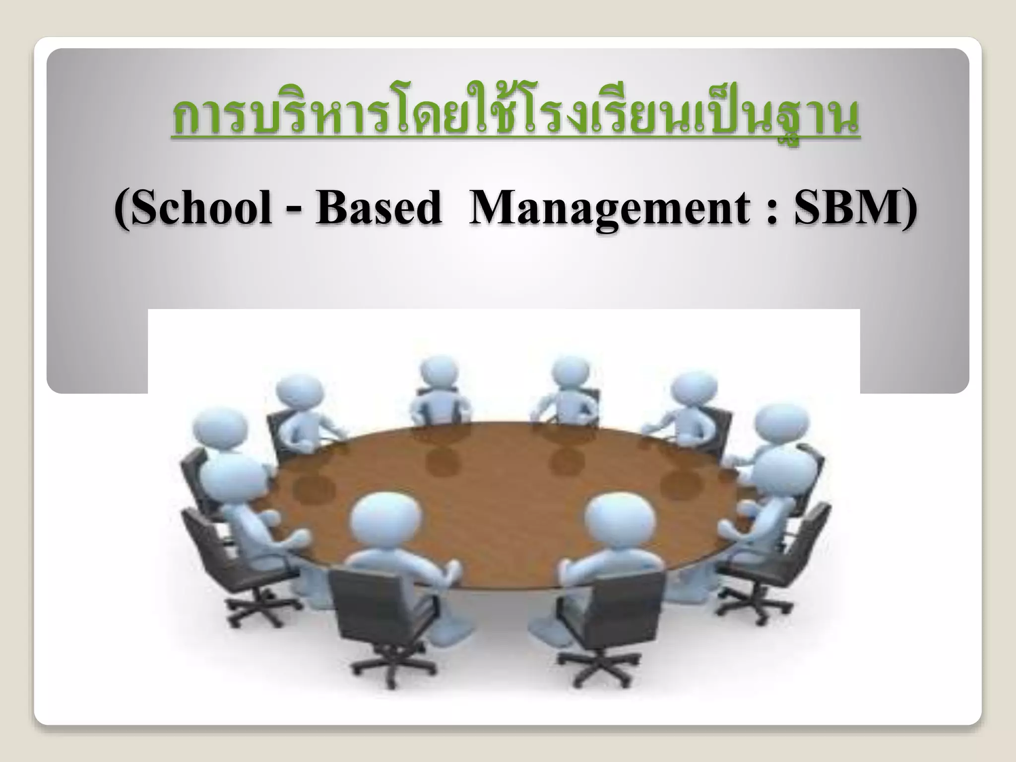 Management : SBM) แนวคิดทำงกำรบริหำรและกำรจัดกำรศึกษำที่มุ่งให้ สถำนศึกษำเป็ นองค์กรหลักในกำรจัดกำรศึกษำอย่ำงมี คุณภำพ ภำยใต้กรอบของกฎหมำยที่กำหนด โดยมีกำร กระจำยอำนำจกำรกำรจัดกำรศึกษำจำกส่วนกลำงไปยัง สถำนศึกษำโดยตรง ให้สถำนศึกษำมีอำนำจหน้ำที่ ควำมรับผิดชอบและควำมคล่องตัวในกำรบริหำร จัดกำรมำกที่สุด