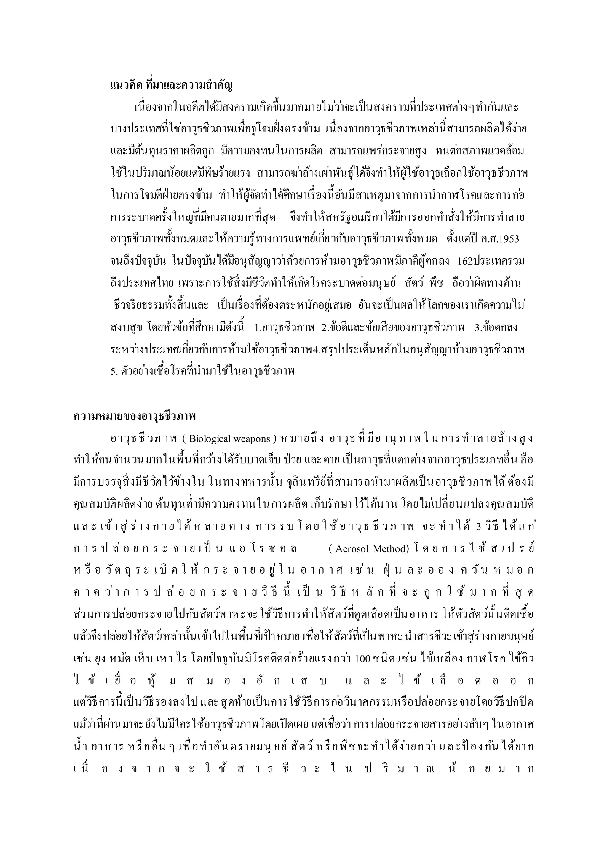มารู้จักอาวุธชีวภาพให้มากขึ้น ความหมายของอาวุธชีวภาพ ข้อดีและข้อเสียของอาวุธชีวภาพ ข้อตกลงระหว่างประเทศเกี่ยวกับการห้ามใช้อาวุธชีวภาพ สรุปประเด็นหลักในอนุสัญญาห้ามอาวุธชีวภาพ ตัวอย่างเชื้อโรคที่นำมาใช้ในอาวุธชีวภาพ สาเหตุ
