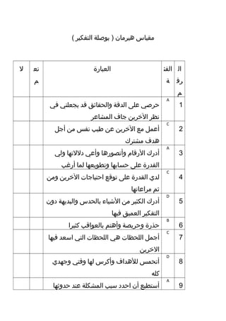 يتناول المستند مقياس هيرمان، الذي يقيس أنماط التفكير المختلفة لدى الأفراد بناءً على نظرية عرضها العالم هيرمان. يهدف المقياس إلى تحسين الفهم والتواصل بين الأفراد في بيئات العمل من خلال تحديد نقاط القوة في التفكير. كما يعرض المستند أبحاثاً تدعم فعالية هذا المقياس وكيف أنه مستخدم من قبل عدة شركات عالمية.