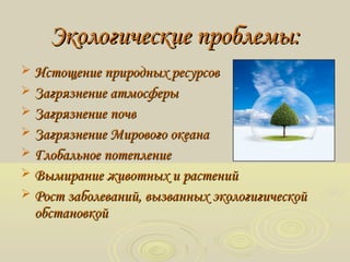 В презентации рассматриваются основные экологические проблемы, такие как загрязнение атмосферы, почвы и мирового океана, а также глобальное потепление и вымирание животных и растений. Предлагаются пути решения этих проблем, включая изменение производственной деятельности, создание охраняемых центров для редких видов и формирование экологического сознания. Также упоминается важность подписания соглашений для сокращения вредных выбросов и применения экологически чистых технологий.