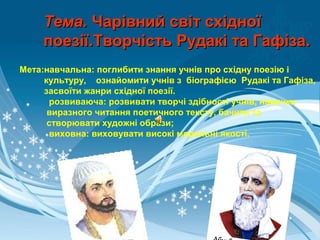культуру, ознайомити учнів з біографією Рудакі та Гафіза,