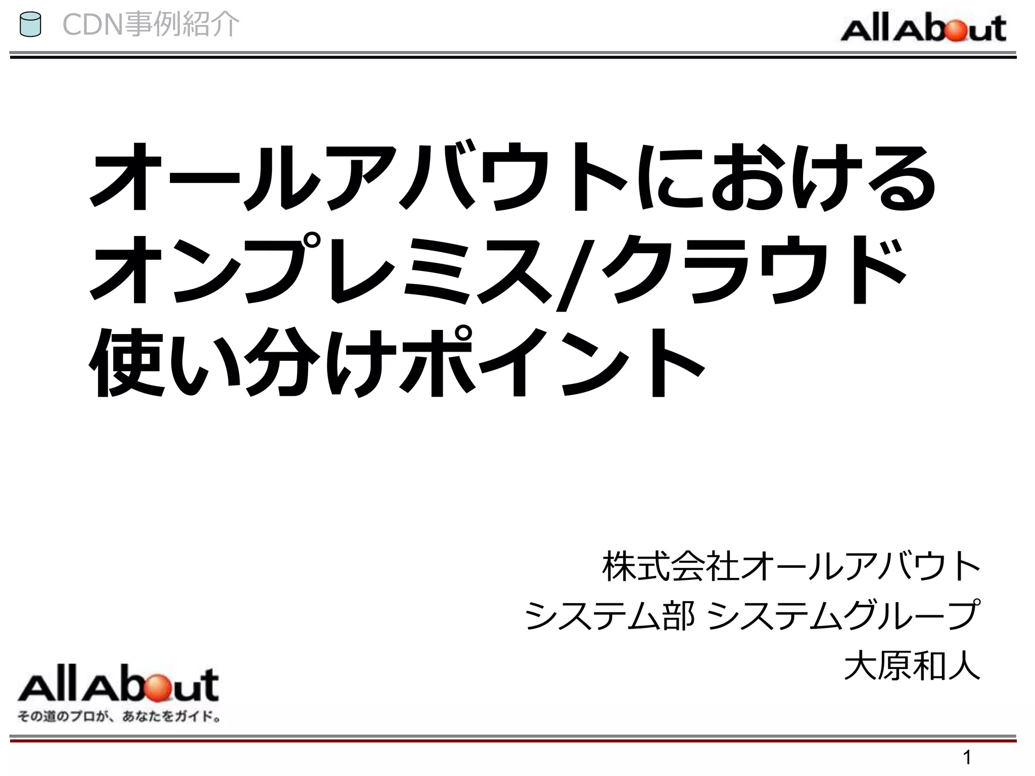 CDN事例紹介 オールアバウトにおける オンプレミス/クラウド 使い分けポイント 株式会社オールアバウト システム部 システムグループ 大原和人 1