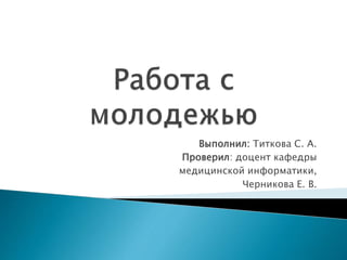 Документ рассматривает работу с молодежью, включая цели и задачи, такие как формирование социокультурной активности и профилактика злоупотребления психоактивными веществами. Описываются структуры и услуги, предоставляемые учреждениями по делам молодежи, а также роль социального работника в поддержке молодежи. Подчеркивается важность работы с неформальными молодежными группами и социальная реабилитация отдельных категорий молодежи, испытывающей трудности.
