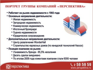Документ описывает проект создания портала для группы компаний 'Перспектива', работающей в сфере недвижимости с 1993 года. Проект включает разработку CRM-системы, которая улучшит взаимодействие с клиентами и автоматизацию риэлтерской деятельности, с акцентом на новые технологии и функционал. В документе также рассматриваются требования к разработчику и результаты, включая обновления дизайна и расширение функционала сайта.