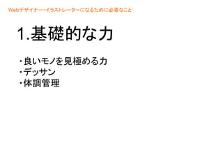 1.基礎的な力 Webデザイナー・イラストレーターになるために必要なこと ・良いモノを見極める力 ・デッサン ・体調管理