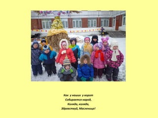 Документ описывает празднование Масленицы, включая традиционные песни, танцы и катания на горках. Люди собираются, чтобы провести время вместе, наслаждаясь блинами и веселыми играми. Атмосфера праздника передает радость и весеннее обновление.