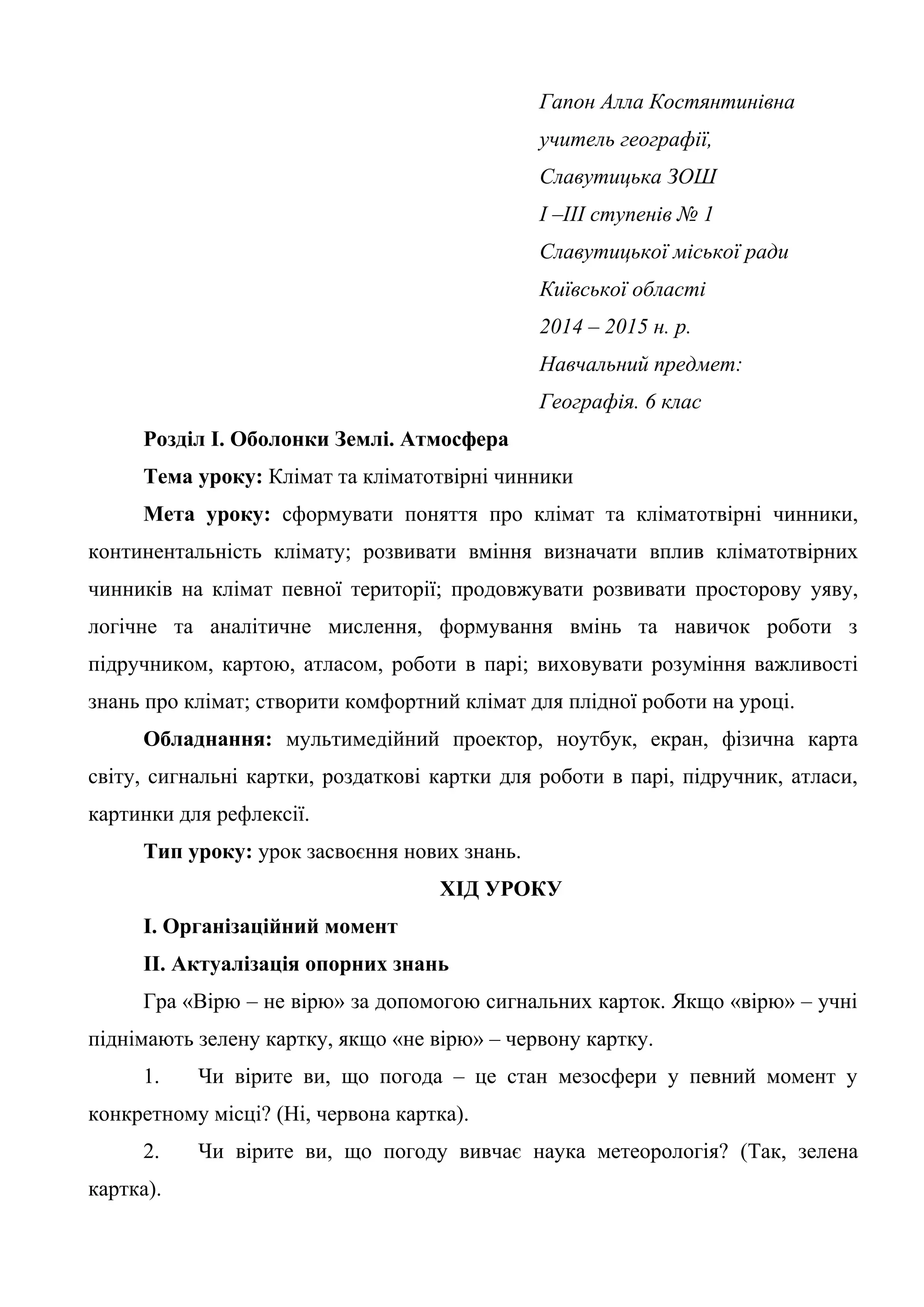 Тема уроку: Клімат та кліматотвірні чинники / А.К. Гапон
