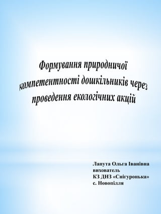 розкрито освітній зміст та інноваційні підходи формування компетентності дітей дошкільного віку щодо природного середовища та життєдіяльності людини в природному довкіллі через проведення екологічних акцій в дитячому садку