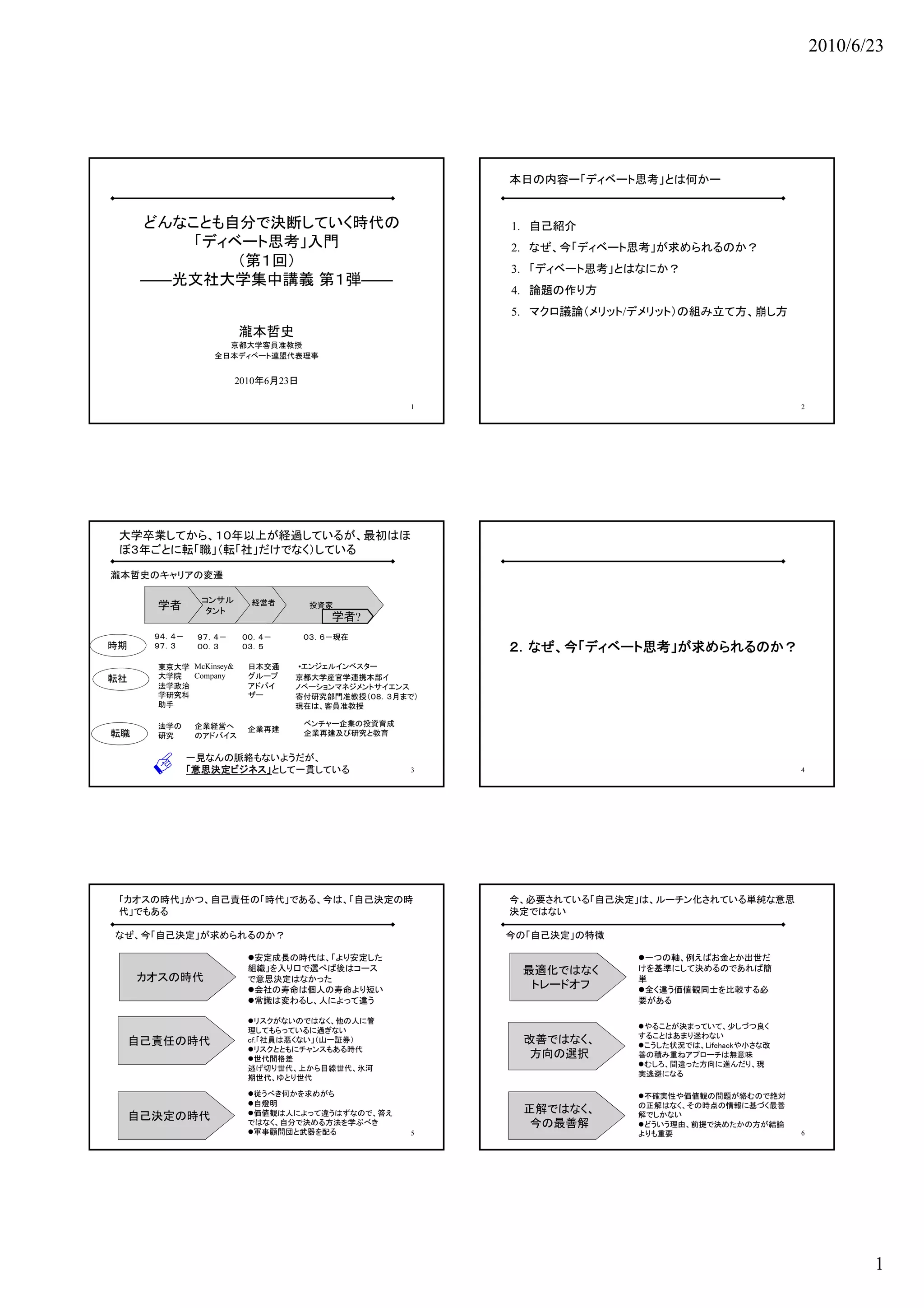 本日の内容ー「ディベート思考」とは何かー どんなことも自分で決断していく時代の 1. 自己紹介 「ディベート思考」入門 2. なぜ、今「ディベート思考」が求められるのか? (第1回) 3. 「ディベート思考」とはなにか? ――光文社大学集中講義 第1弾―― 4. 4 論題の作り方 5. マクロ議論(メリット/デメリット)の組み立て方、崩し方 瀧本哲史 京都大学客員准教授 全日本ディベート連盟代表理事 2010年6月23日 1 2 大学卒業してから、10年以上が経過しているが、最初はほ ぼ3年ごとに転「職」(転「社」だけでなく)している 瀧本哲史のキャリアの変遷 コンサル 経営者 学者 タント 投資家 学者? 94.4- 97.4- 00.4- 03.6-現在 時期 97.3 00.3 03.5 2.なぜ、今「ディベート思考」が求められるのか? 東京大学 McKinsey& 日本交通 •エンジェルインベスター 転社 大学院 Company グループ 京都大学産官学連携本部イ 法学政治 アドバイ ノベーションマネジメントサイエンス 学研究科 ザー 寄付研究部門准教授(08.3月まで) 助手 現在は、客員准教授 法学の 企業経営へ ベンチャー企業の投資育成 企業再建 転職 研究 のアドバイス 企業再建及び研究と教育 一見なんの脈絡もないようだが、 「意思決定ビジネス」として一貫している 3 4 「カオスの時代」かつ、自己責任の「時代」である、今は、「自己決定の時 今、必要されている「自己決定」は、ルーチン化されている単純な意思 代」でもある 決定ではない なぜ、今「自己決定」が求められるのか? 今の「自己決定」の特徴 安定成長の時代は、「より安定した 一つの軸、例えばお金とか出世だ 組織」を入り口で選べば後はコース 最適化ではなく けを基準にして決めるのであれば簡 カオスの時代 で意思決定はなかった 単 会社の寿命は個人の寿命より短い トレードオフ 全く違う価値観同士を比較する必 常識は変わるし、人によって違う 要がある リスクがないのではなく、他の人に管 理してもらっているに過ぎない やることが決まっていて、少しづつ良く することはあまり迷わない 自己責任の時代 cf.「社員は悪くない」(山一証券) 改善ではなく、 こうした状況では、Lifehackや小さな改 リスクとともにチャンスもある時代 世代間格差 方向の選択 善の積み重ねアプローチは無意味 むしろ、間違った方向に進んだり、現 逃げ切り世代、上から目線世代、氷河 実逃避になる 期世代、ゆとり世代 従うべき何かを求めがち 不確実性や価値観の問題が絡むので絶対 自燈明 の正解はなく、その時点の情報に基づく最善 価値観は人によって違うはずなので、答え 正解ではなく、 自己決定の時代 解でしかない ではなく、自分で決める方法を学ぶべき 今の最善解 どういう理由、前提で決めたかの方が結論 軍事顧問団と武器を配る 5 よりも重要 6 1