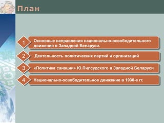 Документ описывает национально-освободительное движение в Западной Беларуси в 1920-х и 1930-х годах, включая деятельность различных политических партий и организаций, таких как КПЗБ и БКРГ, и их борьбу за социальные и национальные права. Особое внимание уделяется тяжелым условиям трудящихся и партизанским формам борьбы, а также репрессиям со стороны польских властей, включая насилие и политический террор. В результате экономического кризиса и политических изменений в Европе, движение продолжало развиваться, несмотря на подавление и внутренние противоречия.