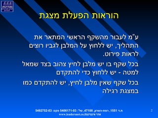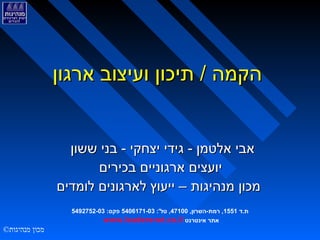 מצגת סוקרת את השלבים המרכזיים בהקמת ארגון חדש: הקמת צוות תיכון, למידה, ניסוח יעוד מטרות וחזון הארגון העתידי, הגדרת מאפייני הארגון ועקרונות הפעולה, הגדרת היחסים עם מערכות אחרות, תיכון מבנה הארגון, הגדרת סביבה תומכת, תכנון היישום, ועד לשלב של הקמת הארגון. מאת: אבי אלטמן, גידי יצחקי, בני ששון, יועצים ארגוניים בכירים, מכון מנהיגות – ייעוץ לארגונים לומדים