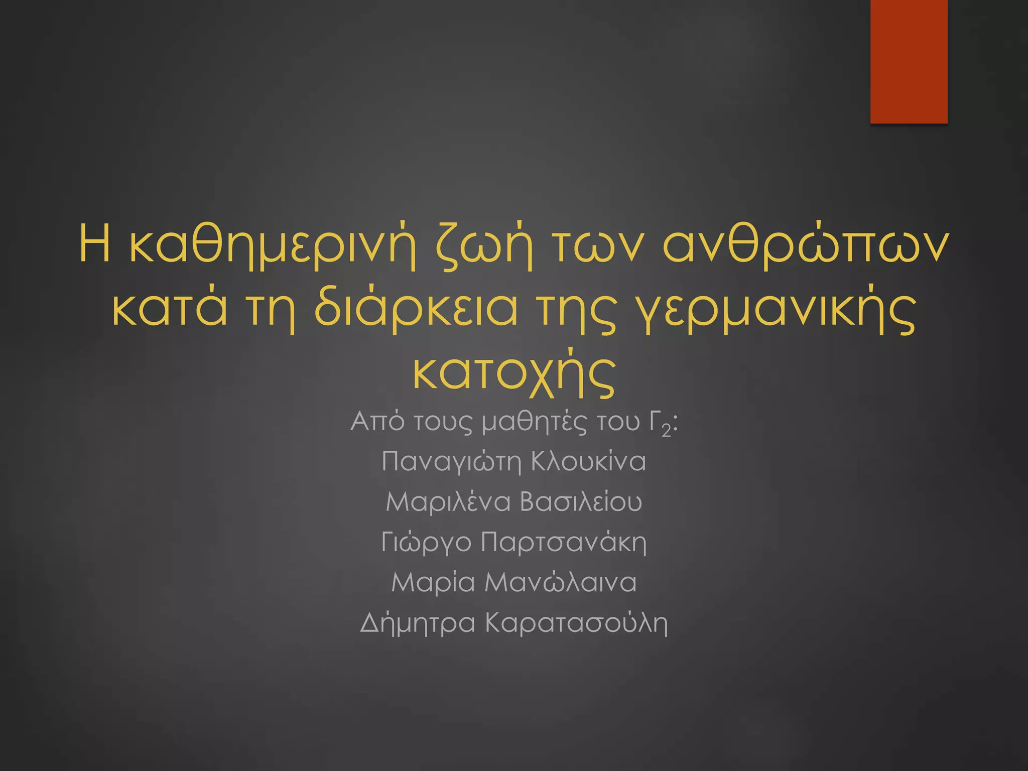 #2 Η παρουσίαση μας έχει ως θέμα την καθημερινή ζωή των ανθρώπων στην κατοχή. Αρχικά θα σας μιλήσουμε λίγο πιο γενικά, δηλαδή πότε και πως ξεκίνησε η κατοχή, τους πρώτους μήνες της καθώς και για την διαίρεση της Ελλάδας σε τομείς. Έπειτα οι πτυχές της ζωής των ανθρώπων που καλύψαμε είναι οι εξής: η διατροφή, οι μετακινήσεις των ανθρώπων, η απαγόρευση κυκλοφορίας των ανθρώπων, η εκπαίδευση και η ψυχαγωγία τους, η ενημέρωση τους και η εργασία τους, η ένδυση τους και τέλος η μαύρη αγορά.