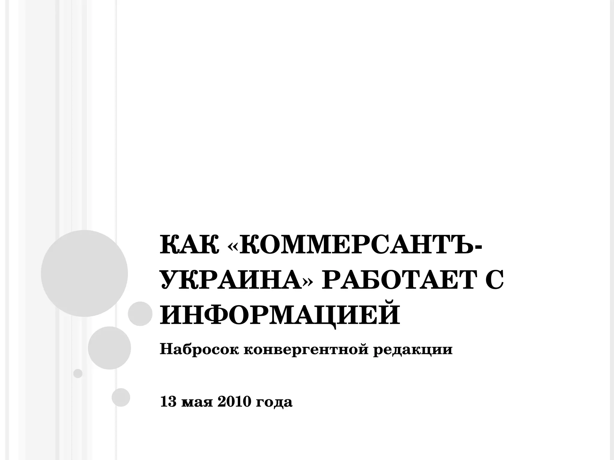 Документ описывает работу редакции 'Коммерсантъ-Украина' с информацией, включая аксиомы, принципы мониторинга новостей и классификации сообщений по важности. В редакции используются четкие алгоритмы действий для обработки информации, что позволяет оперативно реагировать на события и поддерживать актуальность новостей. Основная цель - обеспечить информационное насыщение редакции и качественное предоставление новостей на сайте.