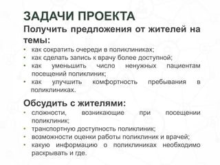 Проект 'Московская поликлиника' собрал идеи от жителей по улучшению работы поликлиник, включая сокращение очередей, повышение доступности записи к врачу и улучшение комфортности пребывания. Основные предложения касаются улучшения систем напоминаний, увеличения рабочих часов поликлиник и создания электронных сервисов. Обсуждения будут продолжены с москвичами через сервис 'Активный гражданин'.