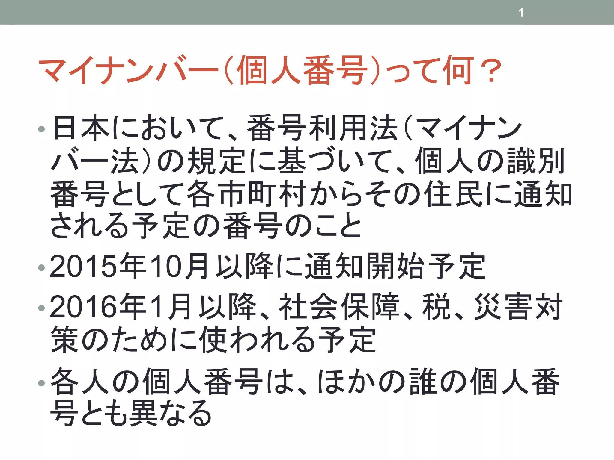 あるところでお話ししたマイナンバー制度入門編の発表資料です。