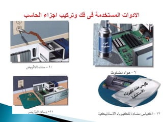 تتناول الوثيقة مجموعة من الأدوات الأساسية لصيانة الحاسوب وأهمية كل أداة في عمليات الصيانة. كما تركز على كيفية الوقاية من مشكلات قد تؤثر على أداء الجهاز مثل الغبار وحرارة التشغيل والحقول المغناطيسية. ينصح بضرورة تنظيف وصيانة الأجهزة بشكل دوري لتفادي الأعطال وتقليل التكاليف.