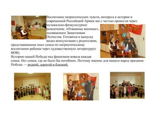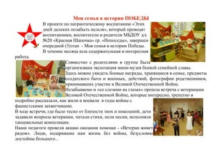 Проект по патриотическому воспитанию, проведенный в детском саду «Красная шапочка», завершил третий этап, где была организована мини-экспозиция боевой семейной славы и встречи с ветеранами Великой Отечественной войны. Дети активно участвовали в мероприятиях, задавали вопросы ветеранам, читали стихи и пели песни, что способствовало их интересу к истории и патриотическим чувствам. Проект включает в себя подготовку видео консультаций для родителей, касающихся патриотического воспитания через художественную литературу.