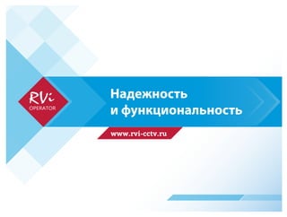 Документ описывает функциональность и надежность системы видеонаблюдения RVI, включая поддержку до 64 каналов видео и управление PTZ-камерами. Упоминаются возможности работы с архивами, тревожными событиями и настройками потоков, а также простота инсталляции и поддержка множества мониторинговых устройств. Также указаны функции фильтрации событий и экспорта данных.