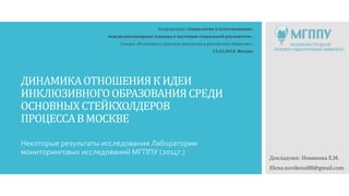 Доклад посвящен исследованию внедрения инклюзивного образования в Москве, основанному на двух волнах мониторинга, проведенных в 2010 и 2014 годах. Основная цель заключалась в оценке социальных эффектов инклюзивного образования через мнения педагогов, родителей и детей. Результаты показывают положительное отношение большинства родителей и некоторые опасения у детей из коррекционных школ.