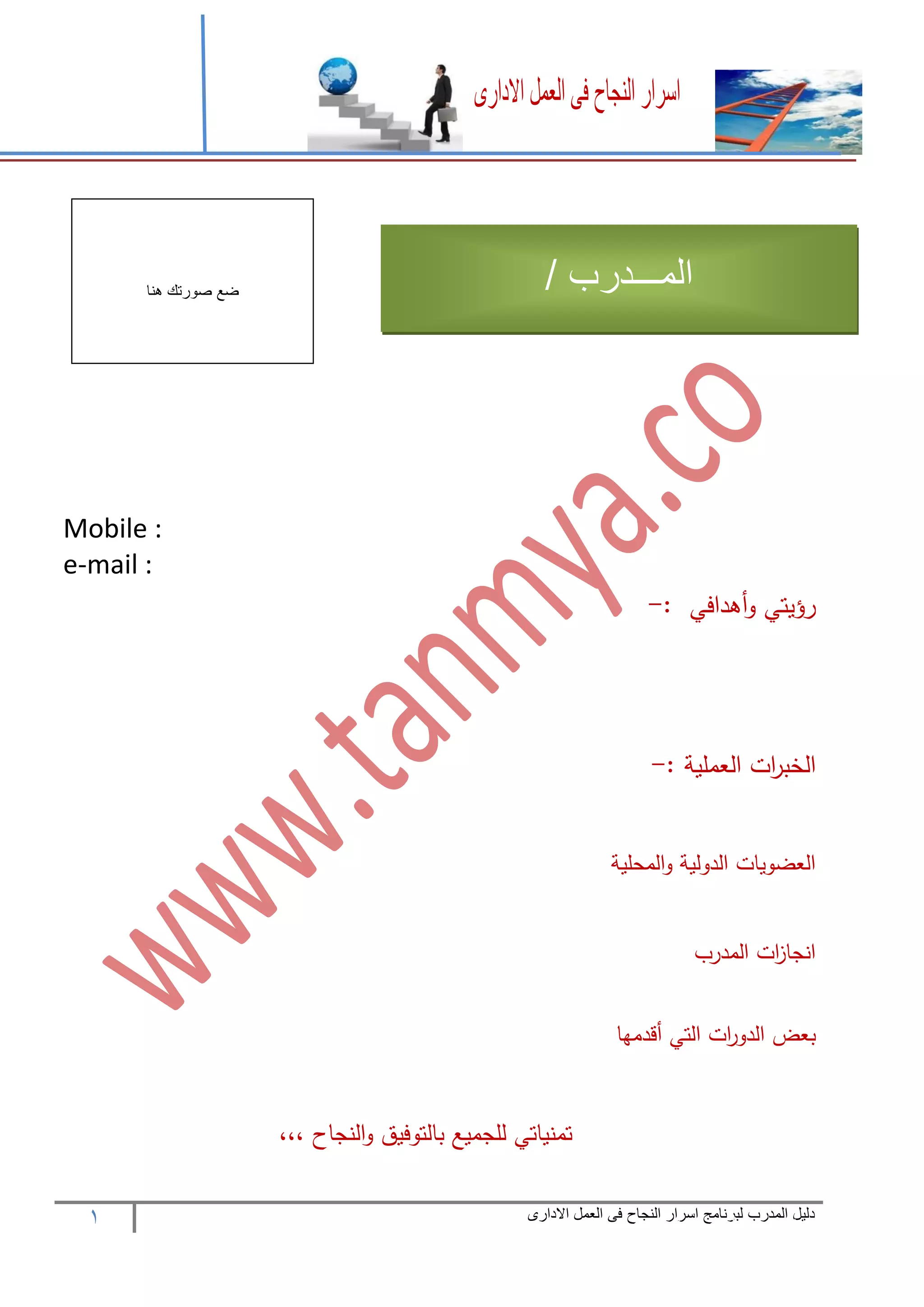 الوثيقة تقدم دليلًا للمدربين حول كيفية تحقيق النجاح في برنامج التدريب، مع التركيز على المفاتيح الأساسية للنجاح وتجاوز الفشل. تسلط الضوء على أهمية تطوير القدرات العقلية وزيادة فرص النجاح من خلال استراتيجيات فعالة. تشجع الوثيقة المشاركين على التعرف على العوامل الدافعة للنجاح وتطوير عادات إيجابية.