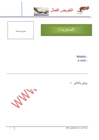دليل تفويض المتدرب يهدف إلى تعريف مفهوم التفويض وأهدافه وأهميته وفوائده، بالإضافة إلى تقديم المعلومات حول معوقات عملية التفويض وكيفية التغلب عليها. يتضمن الدليل وحدات تعليمية تتعلق بمسؤوليات وصلاحيات المدربين وأساسيات التفويض في السياقات الإدارية المختلفة. يجب فهم الثقافة المرتبطة بالتفويض ودوره في تحسين الأداء الوظيفي وتعزيز القيادة الفعالة.
