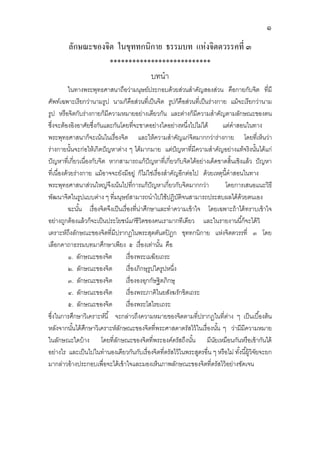 แหงจิตตวรรคที่ ๓ *************************** บทนํา ในทางพระพุทธศาสนาถือวามนุษยประกอบดวยสวนสําคัญสองสวน คือกายกับจิต ที่มี ศัพทเฉพาะเรียกวานามรูป นามก็คือสวนที่เปนจิต รูปก็คือสวนที่เปนรางกาย แมจะเรียกวานาม รูป หรือจิตกับรางกายก็มีความหมายอยางเดียวกัน และตางก็มีความสําคัญตามลักษณะของตน ซึ่งจะตองอิงอาศัยซึ่งกันและกันโดยที่จะขาดอยางใดอยางหนึ่งไปไมได แตคําสอนในทาง พระพุทธศาสนาก็จะเนนในเรื่องจิต และใหความสําคัญแกจิตมากกวารางกาย โดยที่เห็นวา รางกายนั้นจะกอใหเกิดปญหาตาง ๆ ไดมากมาย แตปญหาที่มีความสําคัญอยางแทจริงนั้นไดแก ปญหาที่เกี่ยวเนื่องกับจิต หากสามารถแกปญหาที่เกี่ยวกับจิตไดอยางเด็ดขาดสิ้นเชิงแลว ปญหา ที่เนื่องดวยรางกาย แมอาจจะยังมีอยู ก็ไมใชเรื่องสําคัญอีกตอไป ดวยเหตุนี้คําสอนในทาง พระพุทธศาสนาสวนใหญจึงเนนไปที่การแกปญหาเกี่ยวกับจิตมากกวา โดยการเสนอแนะวิธี พัฒนาจิตในรูปแบบตาง ๆ ที่มนุษยสามารถนําไปใชปฏิบัติจนสามารถประสบผลไดดวยตนเอง ฉะนัน เรืองจิตจึงเป็นเรืองทีน่าศึกษาและทําความเข้าใจ โดยเฉพาะถ้าได้ทราบเข้าใจ อย่างถูกต้องแล้วก็จะเป็นประโยชน์แก่ชีวิตของคนเรามากทีเดียว และในรายงานนีก็จะได้วิ เตราะห์ถึงลักษณะของจิตทีมีปรากฏในพระสุตตันตปิฎก ขุททกนิกาย แห่งจิตตวรรที ๓ โดย เลือกคาถาธรรมบทมาศึกษาเพียง ๕ เรืองเท่านัน คือ ๑. ลักษณะของจิต เรืองพระเมฆิยเถระ ๒. ลักษณะของจิต เรืองภิกษุรูปใดรูปหนึง ๓. ลักษณะของจิต เรืององอุกกัษฐิตภิกษุ ๔. ลักษณะของจิต เรืองพระภาคิไนยสังฆรักขิตเถระ ๕. ลักษณะของจิต เรืองพระโสไรยเถระ ซึงในการศึกษาวิเคราะห์นี จะกล่าวถึงความหมายของจิตตามทีปรากฏในทีต่าง ๆ เป็นเบืองต้น หลังจากนันได้ศึกษาวิเคราะห์ลักษณะของจิตทีพระศาสดาตรัสไว้ในเรืองนัน ๆ ว่ามีมีความหมาย ในลักษณะใดบ้าง โดยทีลักษณะของจิตทีพระองค์ตรัสถึงนัน มีนัยเหมือนกันหรือเข้ากันได้ อย่างไร และเป็นไปในทํานองเดียวกันกับเรืองจิตทีตรัสไว้ในพระสูตรอืน ๆ หรือไม่ ทังนีผู้วิจัยจะยก มากล่าวอ้างประกอบเพือจะได้เข้าใจและมองเห็นภาพลักษณะของจิตทีตรัสไว้อย่างชัดเจน
