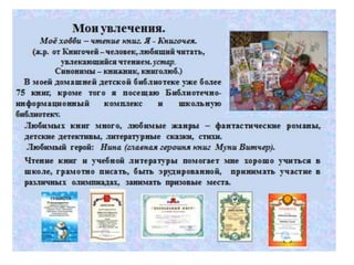 Документ описывает интересы и увлечения нескольких детей с именами Виктория, Елизавета, София и Рузанна. Каждое имя сопровождается характеристиками, увлечениями и личными предпочтениями, такими как любовь к музыке, спорту и животных. Также представлены сведения о возрасте, местах проживания и семейных обстоятельствах детей.