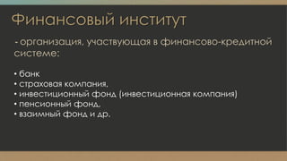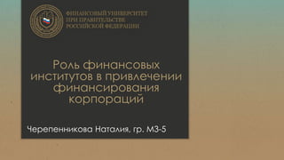 Документ рассматривает роль финансовых институтов в привлечении финансирования для корпораций, перечисляя различные типы этих институтов и их функции. Он также анализирует финансовую систему корпорации, выделяя ее задачи по привлечению и распределению ресурсов, а также источники финансирования. Основное внимание уделяется тому, как структура капитала и инвестиции могут быть организованы для поддержания финансовой стабильности корпорации.