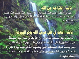 رابعاً : أن وجوههم لنور . عن رسول الله صلى الله عليه وسلم أنه قال : ” إن من عباد الله لأناساً ما هم بأنبياء ولا شهداء يغبطهم الأنبياء والشهداء يوم القيامة بمكانهم من الله تعالى ،قالوا : يا رسول الله تخبرنا من هم؟ قال : ( هم قوم تحابوا بروح الله بينهم على غير أرحام بينهم , ولا أموال يتعاطونها , والله إن وجوههم لنور , وإنهم لعلى نور لا يخافون إذا خاف الناس , ولا يحزنون إذا حزن الناس )