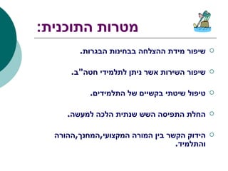 מטרות התוכנית :שיפור מידת ההצלחה בבחינות הבגרות . שיפור השירות אשר ניתן לתלמידי חטה " ב . טיפול שיטתי בקשיים של התלמידים . החלת התפיסה השש שנתית הלכה למעשה . הידוק הקשר בין המורה המקצועי , המחנך , ההורה והתלמיד .