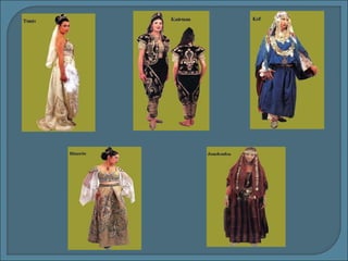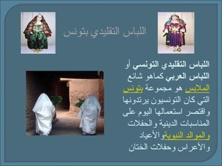 يتناول المستند اللباس التقليدي التونسي وأصوله المتنوعة من العربية والتركية والبربرية والأندلسية، حيث يتميز الجبة والشاشية كقطع رئيسية. يوجد يوم وطني مخصص للاحتفال بهذا اللباس في 16 مارس من كل عام، ويبرز المستند أهمية الصناعة التقليدية في تونس وعراقتها.