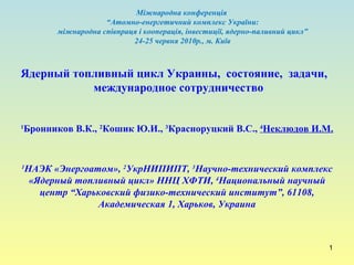 Документ рассматривает состояние и задачи ядерного топливного цикла Украины, включая международное сотрудничество и планы до 2030 года. Основные цели включают полное обеспечение потребностей АЭС в уране и производственные мощности для ядерного топлива. Важное внимание уделяется разработке новых технологий и переходу к реакторам 4-го поколения для обеспечения безопасности и устойчивости ядерной энергетики.