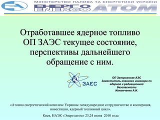 Документ обсуждает текущие подходы к обращению с отработавшим ядерным топливом на Запорожской АЭС, включая технологии хранения и переработки. Приведены прогнозы накопления и управлению отходами, а также международный опыт и перспективы в этой сфере. Обсуждаются задачи модернизации и интеграции технологий обращения с отработанным топливом в стратегические планы Украины.
