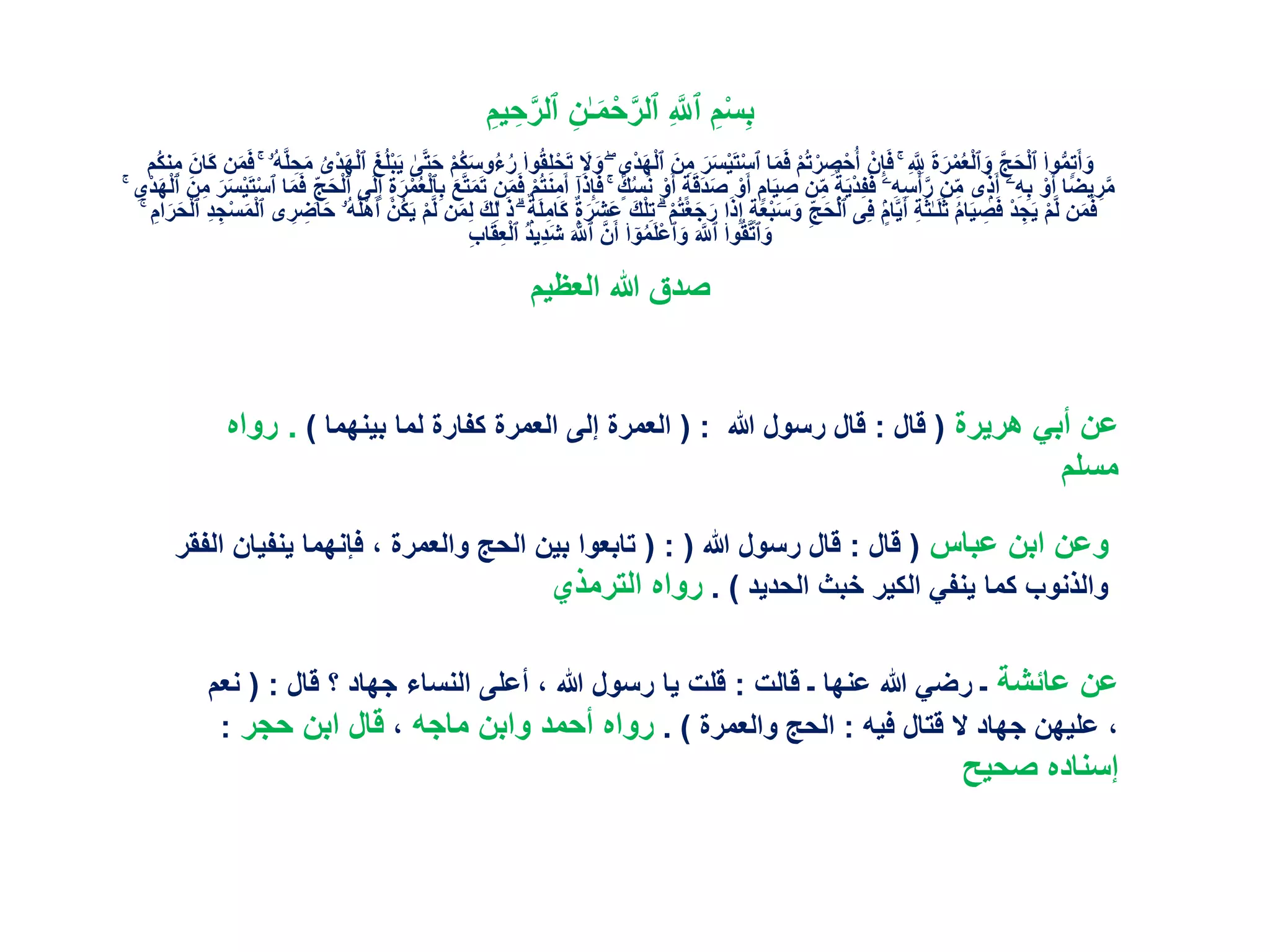 يتناول الوثيقة تفاصيل حول مناسك وأحكام العمرة، بما في ذلك نية الإحرام وطريقة أداء المناسك. كما يشير إلى المحرمات والمباحات خلال الإحرام، وأهمية الطهارة والنظافة. يتضمن أيضًا توجيهات حول كيفية دخول مكة والأدعية المستحب قولها.