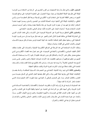 ﺘﻤﺜل ﻤﻨﺫ ﺒﺩﺍﻴﺔ ﺍﻟﺘﺴﻌﻴﻨﻴﺎﺕ ﻤﻥ ﺍﻟﻘﺭﻥ ﺍﻟﻌﺸﺭﻴﻥ ﻓﻲ ﺍﻟﺭﻏﺒﺔ ﻤﻥ ﺍﻻﺴﺘﻔﺎﺩﺓ ﻤـﻥ ﺍﻟﻤﺯﺍﻴـﺎ ﺍﻟﻬﺎﺌﻠﺔ ﺍﻟﺘﻲ ﺘﻁﺭﺤﻬﺎ ﺍﻟﺸﺒﻜﺔ ﺍﻟﻌﻨﻜﻭﺒﺘﻴﺔ ﻤﻥ ﺤﻴﺙ ﺴﻬﻭﻟﺔ ﺍﻟﺤﺼﻭل ﻋﻠﻰ ﺍﻟﻤﻌﻠﻭﻤﺔ ﺍﻟﻤﺘﻭﺍﻓﺭﺓ ﻋﻠﻰ ﻤﻭﺍﻗﻊ ﺍﻟﺒﺤـﺙ ﺍﻟﺸﻬﻴﺭﺓ، ﻭﺭﺨﺹ ﺍﻟﺘﻜﻠﻔﺔ ﺍﻟﻤﺘﺭﺘﺒﺔ ﻋﻠﻰ ﺍﺴﺘﺨﺩﺍﻡ ﺍﻟﺒﺭﻴﺩ ﺍﻻﻟﻜﺘﺭﻭﻨﻲ ﻜﻭﺴﻴﻠﺔ ﺴﺭﻴﻌﺔ ﻟﻨﻘل ﺍﻟﻤﻌﻠﻭﻤـﺔ ﻤـﻥ ﻭﺇﻟـﻰ ﺍ ﺍﻟﻤﺘﻠﻘﻲ، ﻭﺍﻹﻤﻜﺎﻨﻴﺎﺕ ﺍﻟﻬﺎﺌﻠﺔ ﺍﻟﺘﻲ ﺃﺘﺎﺤﺘﻬﺎ ﻏﺭﻑ ﺍﻟﻤﺤﺎﺩﺜﺔ ﻟﻠﺸﺒﺎﺏ ﻤﻥ ﺍﻟﺠﻨﺴﻴﻥ ﻭﺍﻟـﺫﻴﻥ ﻭﺠـﺩﻭﺍ ﻓﻴﻬـﺎ ﻤﻨﻔـﺫﹰ ﻻﺴﺘﺜﻤﺎﺭ ﺃﻭﻗﺎﺕ ﻓﺭﺍﻏﻬﻡ ﺒﻌﺩ ﺃﻥ ﻋﺠﺯﺕ ﺍﻟﺩﻭل ﺍﻟﻌﺭﺒﻴﺔ ﻋﻥ ﻤﻠﺌﻪ ﺒﺄﻨﺸﻁﺔ ﻤﻔﻴﺩﺓ ﻭﺠﺎﺫﺒﺔ، ﻭﺃﺨﻴﺭﹰ ﺘﻭﺠـﻪ ﺒﻌـﺽ ﺍ ﺍﻟﺸﺒﺎﺏ ﻻﺴﺘﺨﺩﺍﻡ ﻤﻌﺭﻓﺔ ﺃﺴﺎﺴﻴﺎﺕ ﺍﻟﺒﺤﺙ ﻋﻠﻰ ﺍﻻﻨﺘﺭﻨﺕ ﻜﺄﺤﺩ ﻋﻭﺍﻤل ﺍﻟﺘﺭﻗﻲ ﻭﺍﻟﺼﻌﻭﺩ ﺍﻻﺠﺘﻤﺎﻋﻲ. ﻭﺍﻟﻤﺴﺘﻭﻯ ﺍﻟﺜﺎﻨﻲ ﺍﻟﻤﺘﻌﻠﻕ ﺒﺩﺭﺠﺔ ﺍﻟﺤﺭﻴﺔ ﻏﻴﺭ ﺍﻟﻤﺴﺒﻭﻗﺔ ﺍﻟﻤﻭﺠﻭﺩﺓ ﻋﻠﻰ ﺍﻻﻨﺘﺭﻨﺕ، ﻭﺍﻟﺘﻲ ﺩﻓﻌﺕ ﺍﻟﺸﺒﺎﺏ ﺍﻟﻌﺭﺒﻲ ﺇﻟﻲ ﺍﻟﻤﺸﺎﺭﻜﺔ ﺍﻟﻔﻌﺎﻟﺔ ﻓﻲ ﻤﻨﺎﻗﺸﺔ ﻗﻀﺎﻴﺎ ﺍﻟﺸﺄﻥ ﺍﻟﻌﺎﻡ ﻭﺍﻟﺘﻌﺒﻴﺭ ﻋﻥ ﻨﻔﺴﻪ ﺒﻜل ﺤﺭﻴﺔ ﺒﻤﻨـﺄﻯ ﻋـﻥ ﻗﻴـﻭﺩ ﺍﻟﺒﻴﺌـﺔ ﺍﻟﺘﺴﻠﻁﻴﺔ ﺍﻟﺘﻲ ﺭﺴﺨﺘﻬﺎ ﻤﻌﻅﻡ ﺍﻟﻨﻅﻡ ﺍﻟﺤﺎﻜﻤﺔ. ﻓﺄﺘﺎﺤﺕ ﻫﺫﻩ ﺍﻟﺒﻴﺌﺔ ﺍﻟﺠﺩﻴﺩﺓ ﻓﺭﺹ ﺠﺩﻴﺩﺓ ﻟﻡ ﺘﻜﻥ ﻤﻭﺠﻭﺩﺓ ﻟﻠﺸـﺒﺎﺏ ﺍﻟﻤﻬﻤﺵ ﻭﺍﻟﺸﺒﺎﺏ ﺍﻟﻤﻨﺘﻤﻲ ﺇﻟﻲ ﺃﻗﻠﻴﺎﺕ ﺴﻴﺎﺴﻴﺔ ﻭﻋﺭﻗﻴﺔ. ﻭﺘﻤﺜﻠﺕ ﺍﻷﺩﻭﺍﺕ ﺍﻟﻤﺴﺘﺨﺩﻤﺔ ﻓﻲ ﻫﺫﻩ ﺍﻟﻤﺭﺤﻠﺔ ﻓﻲ ﺍﻟﻤﻭﺍﻗﻊ ﺍﻻﻟﻜﺘﺭﻭﻨﻴﺔ ﺍﻟﺸﺒﺎﺒﻴﺔ، ﻭﺍﻟﻤﺩﻭﻨﺎﺕ ﺍﻟﺘﻲ ﻋﻜﺴﺕ ﻤﺨﺘﻠﻑ ﺃﺸﻜﺎل ﺍﻟﻁﻴﻑ ﺍﻟﺴﻴﺎﺴﻲ ﻭﺍﻻﻗﺘﺼﺎﺩﻱ ﻭﺍﻻﺠﺘﻤﺎﻋﻲ ﺍﻟﻤﻭﺠﻭﺩﺓ، ﻋﻠﻰ ﻨﺤﻭ ﺘﺤﻭل ﻤﻌﻪ ﺍﻟﻔﻀﺎﺀ ﺍﻻﻟﻜﺘﺭﻭﻨـﻲ ﺇﻟـﻲ ﻤﺠﺘﻤﻊ ﻤﺼﻐﺭ ﻴﻨﺎﻗﺵ ﻨﻔﺱ ﺍﻷﺯﻤﺎﺕ ﻭﺍﻟﻤﺸﺎﻜل ﻟﻜﻥ ﺒﺩﻭﻥ ﺘﺎﺒﻭﻫﺎﺕ ﺘﻘﻠﻴﺩﻴﺔ ﺃﻭ ﻗﻴﻭﺩ ﺇﻻ ﻤـﺎ ﻴﺴـﺘﺤﺩﺜﻪ ﺍﻟﺸـﺒﺎﺏ ﺃﻨﻔﺴﻬﻡ ﻤﻥ ﺘﻨﻅﻴﻡ ﻟﻤﻭﺍﻗﻌﻬﻡ ﺃﻭ ﻤﺩﻭﻨﺎﺘﻬﻡ. ﻓﺎﻗﺘﺤﻤﺕ ﻫﺫﻩ ﺍﻷﺩﻭﺍﺕ ﺘﺎﺒﻭﻫﺎﺕ ﺍﻟﺴﻠﻁﺔ ﻭﺍﻟﺩﻴﻥ ﻭﺍﻟﺠﻨﺱ ﻋﻠـﻰ ﻨﺤـﻭ ﺃﺼﺒﺢ ﻤﻌﻪ ﺍﻟﻤﺠﺘﻤﻊ "ﻤﻜﺸﻭﻓ ﹰ" ﻭﻻ ﻴﻭﺠﺩ ﻓﻴﻪ ﻤﺤﺭﻤﺎﺕ. ﻭﺘﺯﺍﻤﻥ ﺫﻟﻙ ﺒﺎﻟﻁﺒ ﻊ ﻤﻊ ﻨﺸﺎﻁ ﺍﻟﻔﻀـﺎﺌﻴﺎﺕ ﻭﺍﻟﺼـﺤﻑ ﺎ ﺍﻟﺨﺎﺼﺔ ﺍﻟﺘﻲ ﺸﻜﻠﺕ ﺘﺤﺎﻟﻔ ﹰ ﻤﻊ ﺸﺒﺎﺏ ﺍﻻﻨﺘﺭﻨﺕ ﻟﺘﻌﺭﻴﺔ ﺍﻟﺩﻭﻟﺔ ﻭﻜﺸﻑ ﻤﺸﺎﻜﻠﻬﺎ ﺍﻟﺤﻘﻴﻘﺔ. ﺎ ﻭﺍﻟﻤﺴﺘﻭﻱ ﺍﻟﺜﺎﻟﺙ ﺍﻟﺫﻱ ﺸﻬﺩ ﺯﻴﺎﺩﺓ ﺍﻟﺘﺸﺒﻴﻙ ﺍﻻﺠﺘﻤﺎﻋﻲ ﺒﻴﻥ ﺍﻟﻤﺠﻤﻭﻋﺎﺕ ﺍﻟﺸـﺒﺎﺒﻴﺔ ﺍﻟﻤﺨﺘﻠﻔـﺔ، ﻭﺫﻟـﻙ ﺒﻔﻀـل ﺍﻹﻤﻜﺎﻨﻴﺎﺕ ﺍﻟﻬﺎﺌﻠﺔ ﺍﻟﺘﻲ ﻭﻓﺭﺘﻬﺎ ﺸﺒﻜﺔ ﺍﻟﻔﻴﺱ ﺒﻭﻙ، ﻭﺍﻟﺘﻲ ﺍﻨﺘﻘل ﺒﻔﻀﻠﻬﺎ ﺍﻟﻌﻤل ﺍﻟﺸﺒﺎﺒﻲ ﺇﻟﻰ ﺁﻓـﺎﻕ ﺠﺩﻴـﺩﺓ ﻤـﻥ ﺍﻟﺘﻌﺎﻭﻥ ﻭﺍﻟﺘﻜﺎﻤل ﺍﻟﻤﺒﺎﺸﺭ ﺴﻭﺍﺀ ﻋﻠﻰ ﺍﻟﻤﺴﺘﻭﻯ ﺍﻟﻭﻁﻨﻲ ﺃﻭ ﺍﻟﺠﻤﺎﻋﻲ، ﺤﻴﺙ ﻅﻬﺭﺕ ﺁﻻﻑ ﺍﻟﻤﺠﻤﻭﻋـﺎﺕ ﺍﻟﺘـﻲ ﺍﻋﺘﻤﺩﺕ ﺸﻌﺎﺭ "ﺸﺎﺭﻙ ﺇﺫﺍ ﻜﻨﺕ ﻤﻬﺘﻤ ﹰ". ﺎ ﻫﺫﻩ ﺍﻟﻤﺴﺘﻭﻴﺎﺕ ﻟﻡ ﺘﻭﺠﺩ ﻓﻲ ﻓﺭﺍﻍ، ﻭﺇﻨﻤﺎ ﺘﺄﺜﺭﺕ ﺒﺎﻟﻅﺭﻭﻑ ﺍﻟﺴﻴﺎﺴﻴﺔ ﻭﺍﻻﻗﺘﺼﺎﺩﻴﺔ ﻭﺍﻻﺠﺘﻤﺎﻋﻴـﺔ ﺍﻟﺴـﺎﺌﺩﺓ ﻓـﻲ ﺍﻟﺩﻭل ﺍﻟﻌﺭﺒﻴﺔ، ﻭﺍﻟﺘﻲ ﺃﺴﻬﺒﺕ ﻜﺜﻴﺭ ﻤﻥ ﺍﻟﺩﺭﺍﺴﺎﺕ ﻓﻲ ﺍﻟﺤﺩﻴﺙ ﻋﻥ ﺃﺴﺒﺎﺒﻬﺎ ﻭﻜﻴﻔﻴﺔ ﺘﺄﺜﻴﺭﻫﺎ ﻋﻠﻰ ﺍﻟﺸﺒﺎﺏ، ﻭﺍﻟﺘـﻲ ﻜﺎﻥ ﻤﻥ ﺃﻫﻤﻬﺎ ﻓﻘﺩﺍﻥ ﺍﻟﺸﺒﺎﺏ ﺍﻟﺜﻘﺔ ﻓﻲ ﺍﻟﻤﺅﺴﺴﺎﺕ ﻭﺍﻷﺠﻬﺯﺓ ﺍﻟﺤﻜﻭﻤﻴﺔ، ﻭﺍﻟﺼﺭﺍﻉ ﻤﻊ ﺍﻷﺠﻴﺎل ﺍﻷﻜﺒـﺭ ﺴـﻨ ﹰ، ﺎ ﻭﺍﻟﺒﺤﺙ ﻋﻥ ﻫﻭﻴﺔ ﺠﺩﻴﺩﺓ ﻟﻠﺸﺒﺎﺏ ﻓﻲ ﻋﺎﻟﻡ ﻴﻤﺘﺎﺯ ﺒﺎﻟﺼﺭﺍﻉ ﺒﻴﻥ ﺍﻟﺜﺎﺒﺕ ﻭﺍﻟﻤﺘﻐﻴﺭ، ﺍﻟﻤﺤﻠﻰ ﻭﺍﻟﻌﺎﻟﻤﻲ، ﻭﺍﻟﺘﻭﺍﺼـل ﺍﻟﻤﺴﺘﻤﺭﺓ ﻤﻘﺎﺒل ﺍﻟﺭﻏﺒﺔ ﻓﻲ ﺍﻻﻨﻜﻔﺎﺀ ﻭﺍﻻﻨﻌﺯﺍل. 2