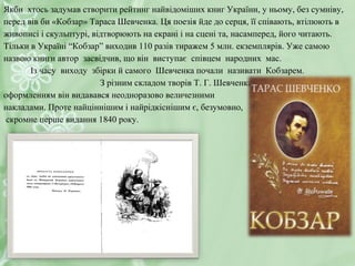 Тільки в Україні “Кобзар” виходив 110 разів тиражем 5 млн. екземплярів. Уже самою