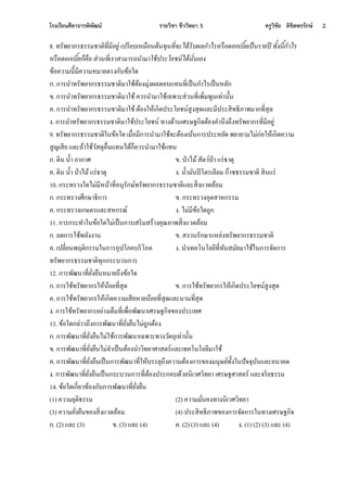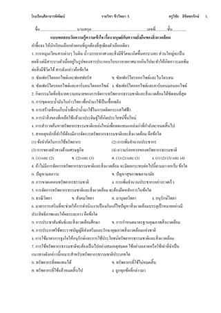 5 ครูวิชัย ลิขิตพรรักษ์ 1. ชื่อ......................................นามสกุล.........................................................เลขที่............ชั้น.............. แบบทดสอบวัดความรู้ความเข้าใจ เรื่อง มนุษย์กับความยั่งยืนของสิ่งแวดล้อม คาชี้จง ให้นนักเีีนนเลือกคาออททีู่กกอนอ ที่สุเีีน อัเเลือกเีีนเ 1.ใกาี้มุนเเีนนสาีอ่า ๆใหนีินใน้าใทีีนากาศใจละสิ่ มีชีเิองะเกิีขึ้นคีทเ งีใส่เนห้ญ่งะเป็น ผลีีใจอ่มีสาีทา อัเเมื่ออนก่หนีกปขอ สาีปีะกอทหนทีีนานกาศมากเกินไปงะทาห้นเกิีภาเะมลีิษ อ่อสิ่ มีชีเิอไีนใสาีีั กล่าเคือขนอหี ก.ใซัลเฟอี์ไีออกไซี์จละฟอสฟอีัส ข.ใซัลเฟอี์ไอีออกไซี์จละไนโอีเงน ค.ใซัลเฟอี์ไอีออกไซี์จละคาี์ทอนไีออกไซี์ .ใซัลเฟอี์ไีออกไซี์จละคาี์ทอนมอนอกไซี์ 2. กิงกีีมหีที่อธิทานคเาม้มานขอ กาีงัีกาีทีัีนากีธีีมชาอิจละสิ่ จเีลนอมไีนชัีเงนที่สุี ก.ใกาีขุีเงาะน้ามันหนอ่าเไทนใเีื่อนามาหชนเป็นเชื้อเีลิ ข.ใกาีสีนา เขื่อนเก็ทน้าเีื่อนาน้ามาหชนหนกาีผลิอกีะจสไฟฟนา ค.ใกาีนาสิ่ ขอ ที่เ้ลือหชนจลนเมาปีะีิษฐ์ห้นเกิีปีะโนชน์ขึ้นห้ม่ .ใกาีสาีเงคนน้าทีัีนากีธีีมชาอิจ้ล่ ห้ม่เีื่อทีจทนจ้ล่ เก่าที่กาลั งะ้มีสิ้นไป 3. สาเ้อุ้ลักที่ทาห้นอนอ มีกาีงัีกาีทีัีนากีธีีมชาอิจละสิ่ จเีลนอมใคือขนอหี (1) ขนองากัีหนกาีหชนทีัีนากี (2) กาีเีิ่มงานเนปีะชากี (3) กาีขนานอัเทา ีนานเศีษฐกิง (4) คเามี่อน้ีอขอ ทีัีนากีธีีมชาอิ ก.ใ(1) จละใ(2) ข.ใ(2) จละใ(3) ค.ใ(1) (2) จละใ(3) .ใ(1) (2) (3) จละใ(4) 4. ูนาไม่มีกาีงัีกาีทีัีนากีธีีมชาอิจละสิ่ จเีลนอมใงะมีผลกีะททอ่อไปนี้อามมาในกเเนนใขนอหี ก.ใปัญ้ามลภาเะ ข.ใปัญ้าสุขภาีีลานามัน ค.ใกาีขาีจคลนทีัีนากีธีีมชาอิ .ใกาีเีิ่มงานเนปีะชากีอน่า ีเีเี็เ 5. กาีงัีกาีทีัีนากีธีีมชาอิจละสิ่ จเีลนอมใงะอนอ นึี้ลักกาีหนขนอหี ก.ใธีณีเิทนา ข.ใสั คมเิทนา ค.ใมานุษนเิทนา .ใอนุีักษ์เิทนา 6. มาอีกาีเสีิมที่งะช่เนห้นกาีีาเนิน านปน อ กันจกนไขปัญ้าสิ่ จเีลนอมทีีลุเปน า้มานอน่า มี ปีะสิทธิภาีจละห้นผลีะนะนาเใคือขนอหี ก.ใกาีปีะชาสัมีันธ์จละสิ่ จเีลนอมศึกษา ข.ใกาีกา้นีมาอีฐานคุณภาีสิ่ จเีลนอม ค.ใกาีปีะกาศหชนีีะีาชทัญญัอิส่ เสีิมจละีักษาคุณภาีสิ่ จเีลนอมจ้่ ชาอิ .ใกาีหชนมาอีกาีงก หงห้นอนุีักษ์จละกาีหชนปีะโนชน์ทีัีนากีธีีมชาอิจละสิ่ จเีลนอม 7. กาีหชนทีัีนากีธีีมชาอิงะอนอ เป็นไปอน่า สมเ้อุสมผลใหชนอน่า ฉลาี้ีือหชนเท่าที่งาเป็นใ จนเทา ีั กล่าเนี้เ้มาะสา้ีัททีัีนากีธีีมชาอิปีะเภทหี ก.ใทีัีนากีที่ทีจทนไีน ข.ใทีัีนากีที่หชนไม่้มีสิ้น ค.ใทีัีนากีที่หชนจลนเ้มีสิ้นไป .ใูกกทุกขนอที่กล่าเมา