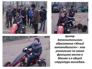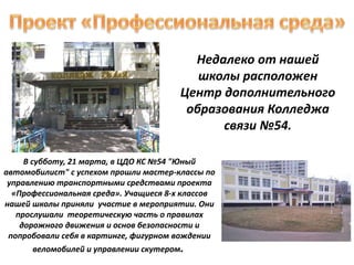 В ближайшем центре дополнительного образования колледжа связи №54 состоялись мастер-классы для учащихся 8-х классов по управлению транспортными средствами в рамках проекта «профессиональная среда». Учащиеся узнали правила дорожного движения и попробовали себя в картинге, фигурном вождении веломобилей и управлении скутером. Центр предлагает уникальные возможности для знакомства с научно-техническим творчеством и полезными навыками в сфере автоспорта.