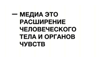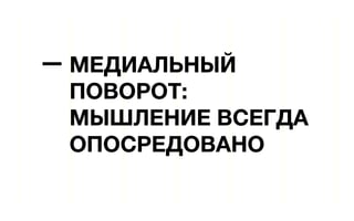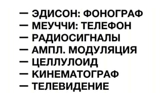 — Развитие способов передачи сигнала в истории человечества — Что такое медиа? От древних греков до Маршалла Маклюэна — Судьба сингулярности. Что осталось от Дрекслера и Тоффлера? — Куда мы идём? «Матрица» против «Соляриса». — Что делать сегодня? Медиаскетизм, скептическое мышление, техно-образование.