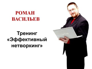 Документ описывает тренинг по эффективному нетворкингу, проводимый Романом Васильевым, который имеет 22-летний опыт в продажах и 17-летний опыт в маркетинге. Тренинг ориентирован на бизнесменов и людей, стремящихся развивать навыки коммуникации, и включает в себя практические техники по созданию и поддержанию сети контактов. Участники научатся использованию социальных сетей и деловых мероприятий для расширения своих возможностей и достижения успеха.