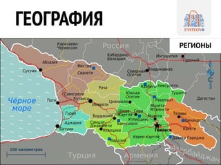 Документ содержит информацию о географии Грузии, включая регионы, валюту и режим въезда для граждан России. Приведены расписания рейсов в Тбилиси, Кутаиси и Батуми, а также описаны экскурсионные и гастрономические туры, отели и курорты для отдыха. Документ также включает информацию о здравницах, таких как Боржоми, и предлагает контакты для туристических агентств.