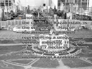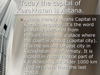 Astana is the current capital of Kazakhstan, located in the north-central part of the country. It was formerly known as Akmolinsk and Tselinograd before being designated the capital in 1997. Since becoming the capital, Astana has grown dramatically and now serves as the center of government and business in Kazakhstan, with all government organizations and over 100 foreign businesses and joint ventures located there. The city blends modern architecture with oriental influences and is becoming a major economic hub.